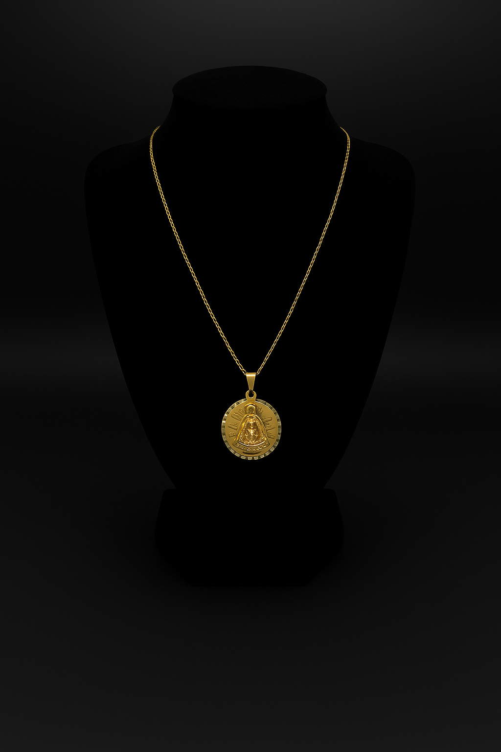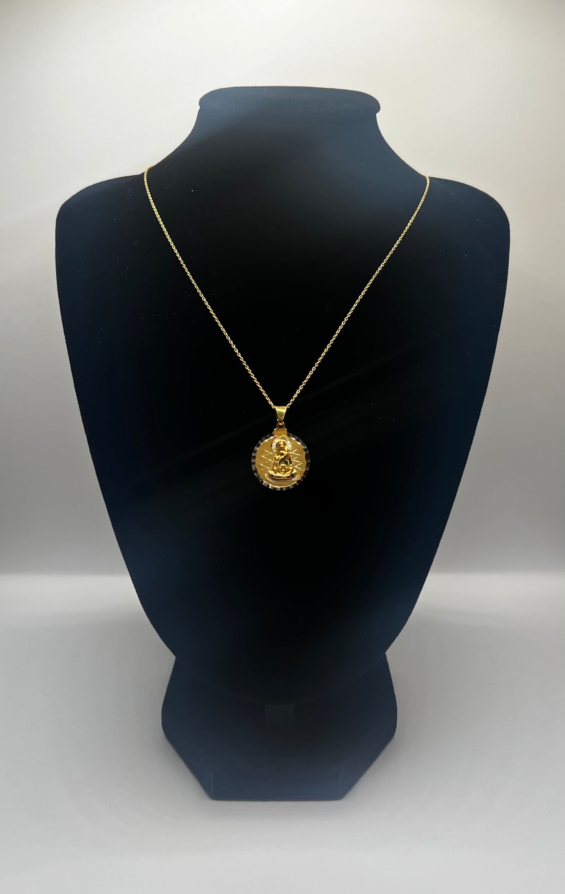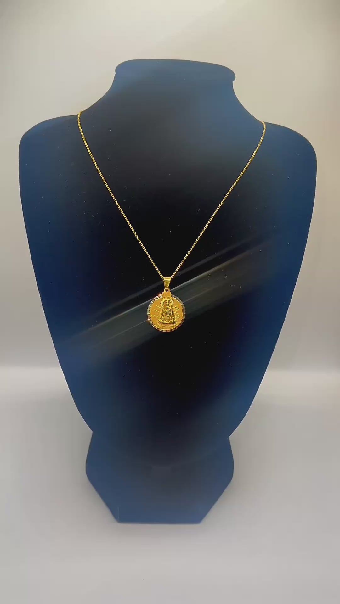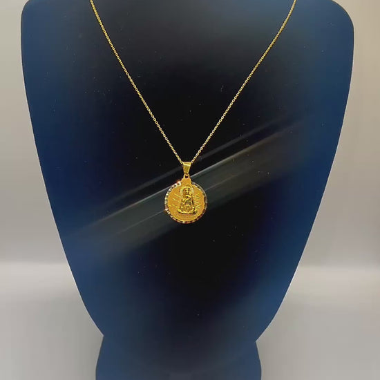 A beautifully crafted 10K yellow gold necklace featuring the Virgin of Charity (Our Lady of Charity of El Cobre) — Cuba’s beloved patron saint. This medallion, measuring 16mm and weighing approximately 2.6 grams, showcases intricate detailing that radiates devotion and elegance.