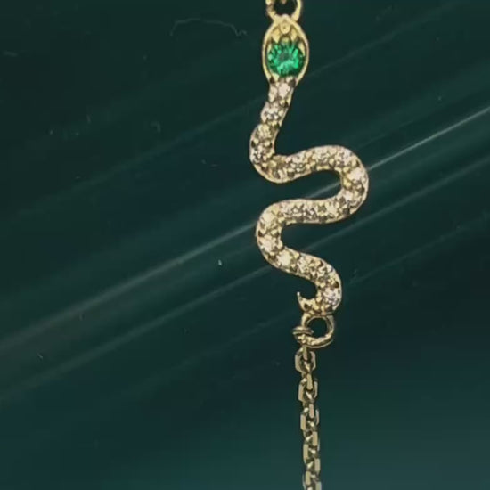 Elegante pulsera de oro amarillo 10K con un diseño de serpiente fina y brillante, símbolo de poder y transformación. Su cuerpo adornado con detalles de circonias resplandecientes y una piedra verde en los ojos le aporta un toque de lujo y misterio.